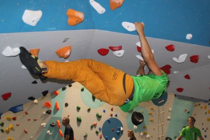 Bouldern bedeutet Klettern in Absprunghöhe ohne Seilsicherung. Wer einen anvisierten Griff nicht halten kann, landet weich in der Bouldermatte. |